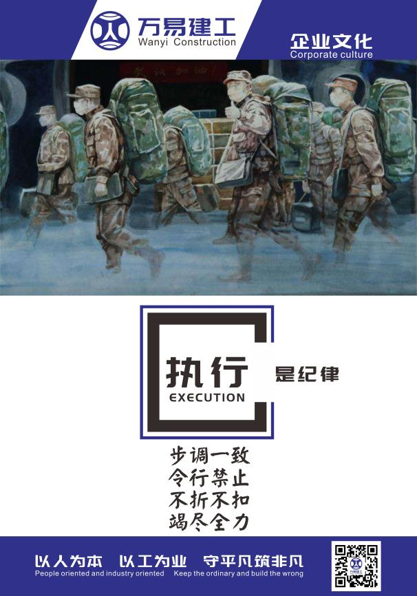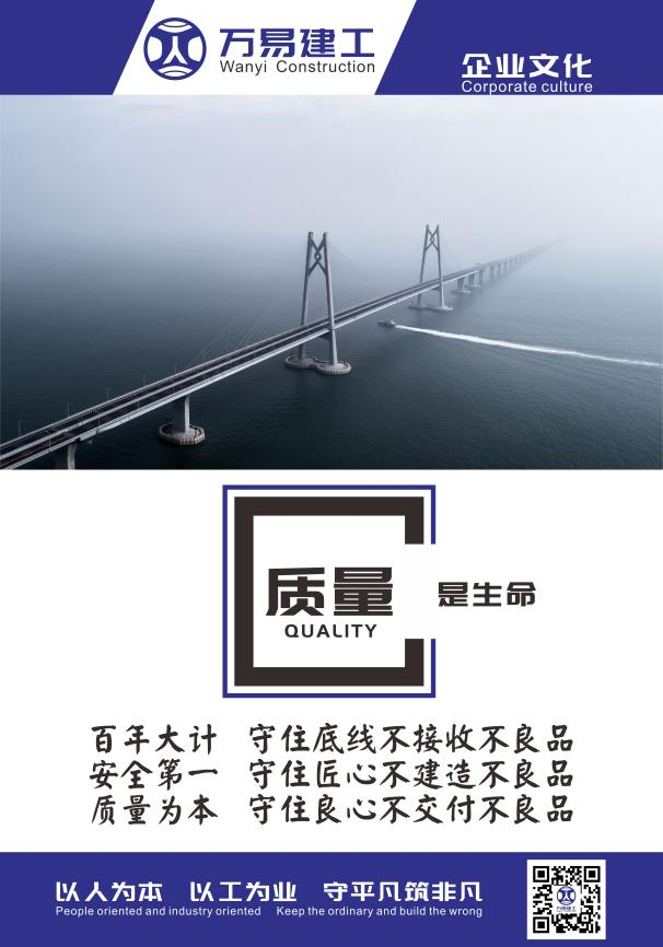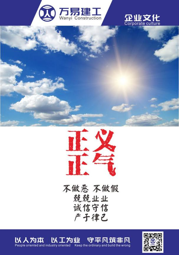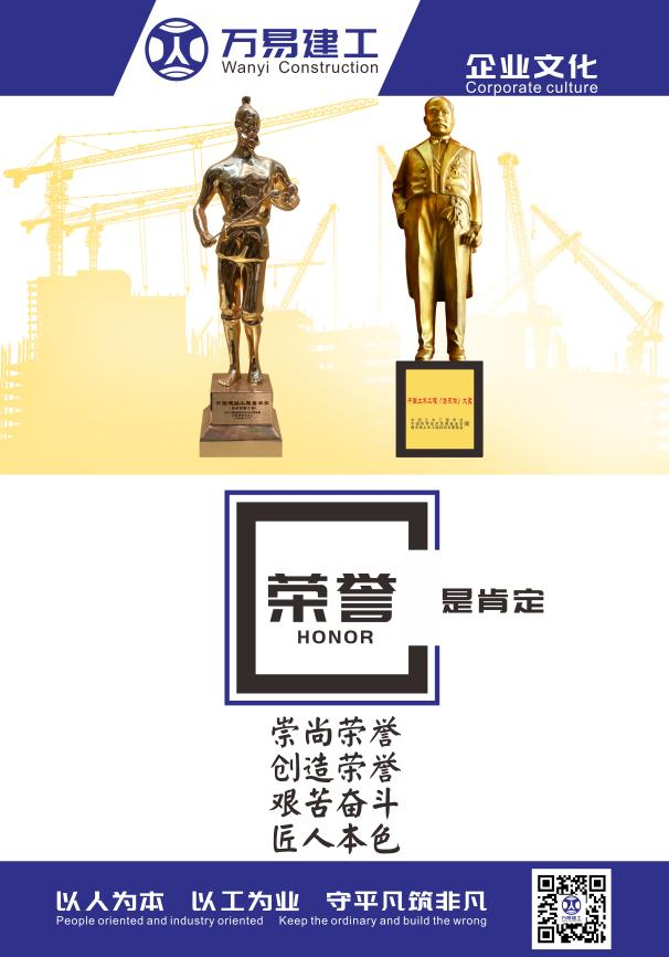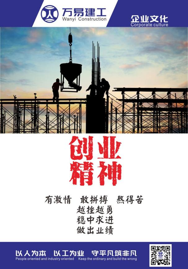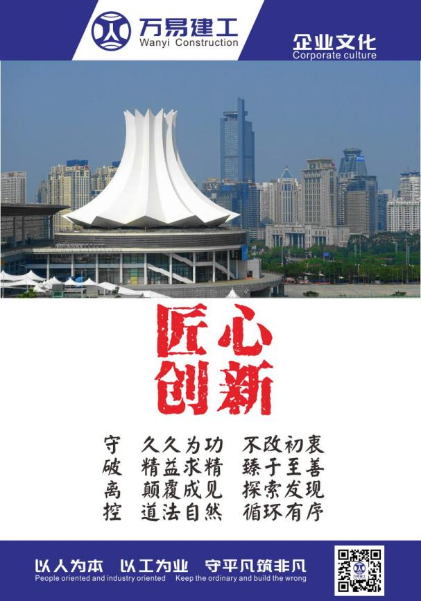 实现匠人企业、幸福企业愿景是万易建工的集体意志和最高纲领,用我们的专业和热爱、赤诚和匠心,成就幸福客户、成就幸福员工,让更多的人过上幸福的生活,为建工行者提供广阔平台,共同探索新可能、共创新可能、实现新可能,实现与企业共生共享共治共赢。万易建工始终以“工者至实”服务社会、始终以“大行至善”服务民生的普惠理念构建企业文化体系,以最质朴的“搬砖”精神的坚守和传承构筑企业价值观。“以人为本、以工为业、守平凡筑非凡”是我们对建工行业的笃信、坚守与传承,用智慧和汗水写实万易建工人甘为孺子牛的开拓和奉献精神,初心不改、使命依然,默默耕耘只为人间筑造美好的愿景;以“诚信、合规、务实、高效、专业、质量、团队、忠诚、执行、责任、荣誉”赢得客户信赖和实现自我赋能,以“正义正气、成就员工、客户思维、创业精神、匠心创新”的勇气和担当承担社会责任、奉献光和热,不断传递正能量。