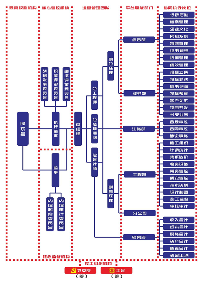 万易建工股权重组后组织架构设置为“31534”模型。即3个机构:最高权利机构(股东会)、核心管控机构(执行董事)、核心监督机构(监事);1个运营管理团队(总经理、总法律顾问、总工程师、总会计师、副总经理),5个部门(综合部、业务部、法务部、工程部、财务部),34个协同执行岗位(行政后勤、档案管理、企业文化、网络系统、招聘管理、证书管理、培训管理、绩效管理、投标立项、投标外联、标书研编、投标预算、客户关系、项目开发、分支业务、合规审控、涉讼事务、施工组织、计调统计、集采造价、物资设备、劳资管控、质安管控、技术资料、设计制图、施工监督、审核审计、收入会计、成本会计、税务会计、资产会计、核算会计、资金出纳)。万易建工“31534”模型设置,形成“管理机构、管理团队、职能部门、执行岗位”四位一体,所有权和治理权权限边界泾渭分明,垂直管理又相互协调、各司其职又横向保障、支持操作又监督控制,高度制度化和最简流程化,使法人治理合规灵活,运作纪律张驰有度,充分赋能团队的每一位成员,确保业务处理流程顺畅、专业高效,保证企业与客户效益目标的综合实现。