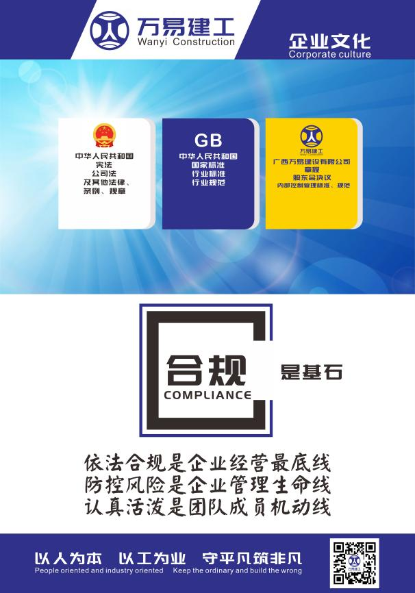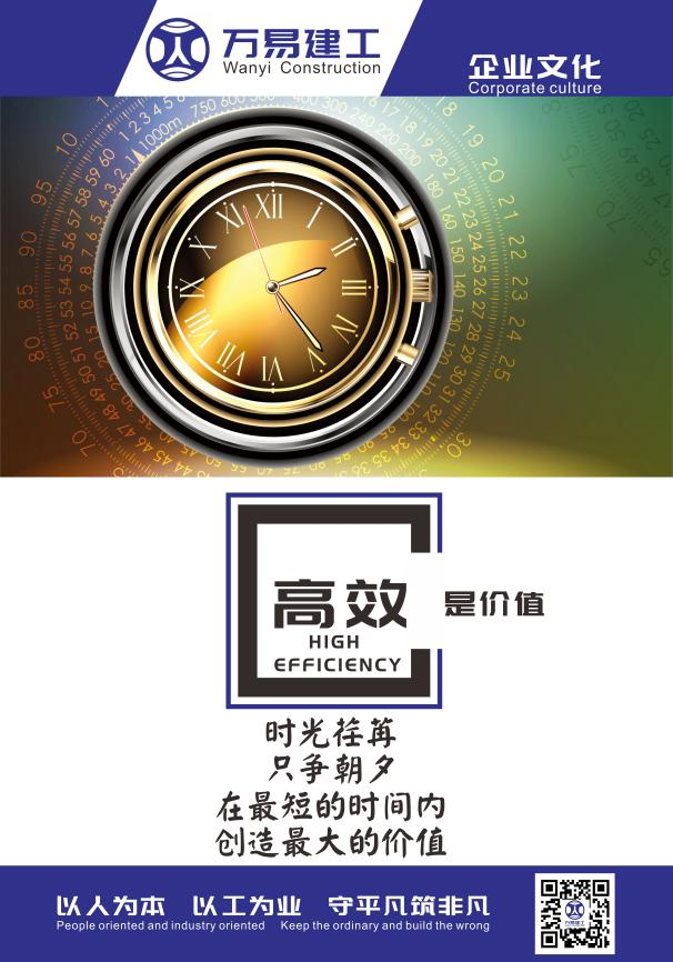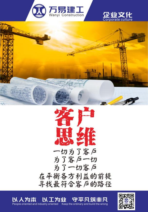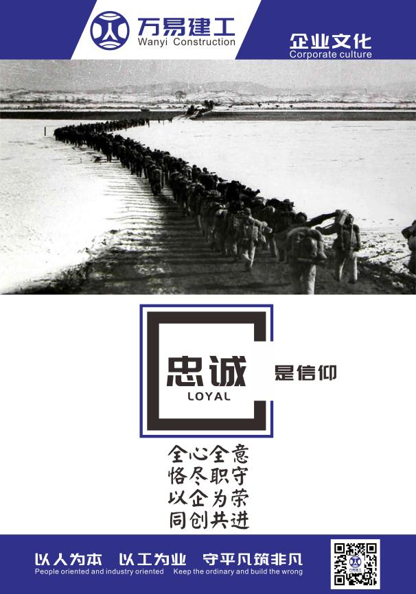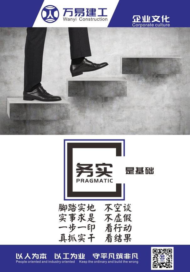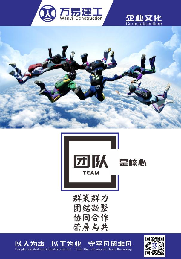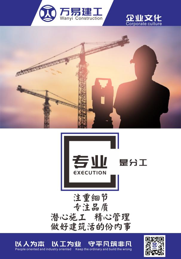 实现匠人企业、幸福企业愿景是万易建工的集体意志和最高纲领,用我们的专业和热爱、赤诚和匠心,成就幸福客户、成就幸福员工,让更多的人过上幸福的生活,为建工行者提供广阔平台,共同探索新可能、共创新可能、实现新可能,实现与企业共生共享共治共赢。万易建工始终以“工者至实”服务社会、始终以“大行至善”服务民生的普惠理念构建企业文化体系,以最质朴的“搬砖”精神的坚守和传承构筑企业价值观。“以人为本、以工为业、守平凡筑非凡”是我们对建工行业的笃信、坚守与传承,用智慧和汗水写实万易建工人甘为孺子牛的开拓和奉献精神,初心不改、使命依然,默默耕耘只为人间筑造美好的愿景;以“诚信、合规、务实、高效、专业、质量、团队、忠诚、执行、责任、荣誉”赢得客户信赖和实现自我赋能,以“正义正气、成就员工、客户思维、创业精神、匠心创新”的勇气和担当承担社会责任、奉献光和热,不断传递正能量。